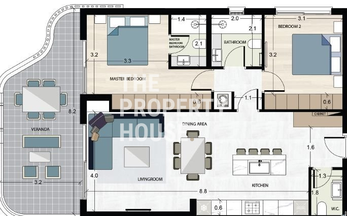 The apartment has a specious veranda, open plan kitchen-living area with sea and city view, guest bathroom, large master bedroom with en-suite bathroom, and another spacious bedroom both with modern built-in wardrobes.