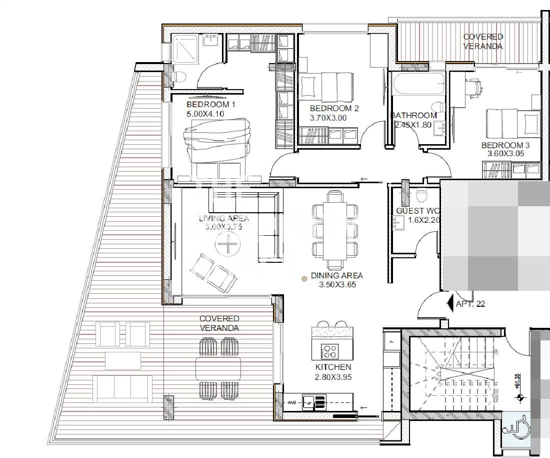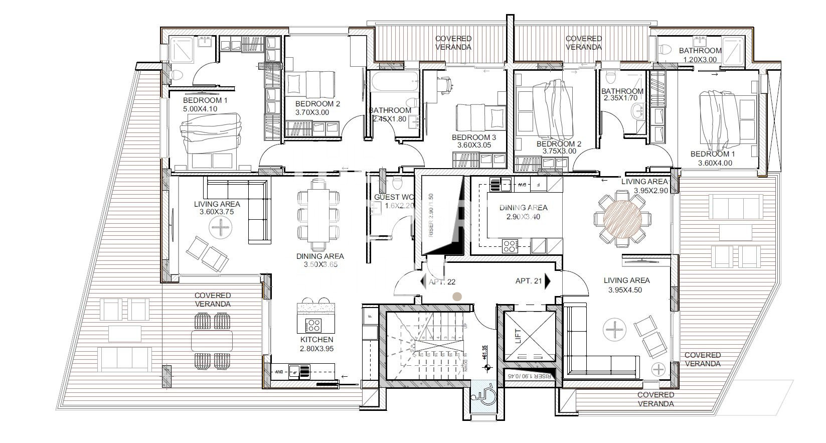 The apartment features a spacious open plan living, dining and kitchen area, with a guest toilet, connected to a large covered veranda, ideal for enjoying the cool summer breeze. Through a sliding door, we find a master bedroom with an ensuite shower, two more bedrooms, another bathroom and a covered balcony. A covered parking space and storage room can be found at the ground level.