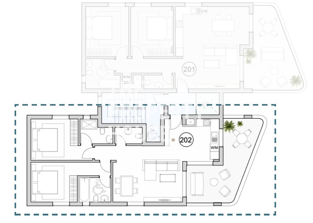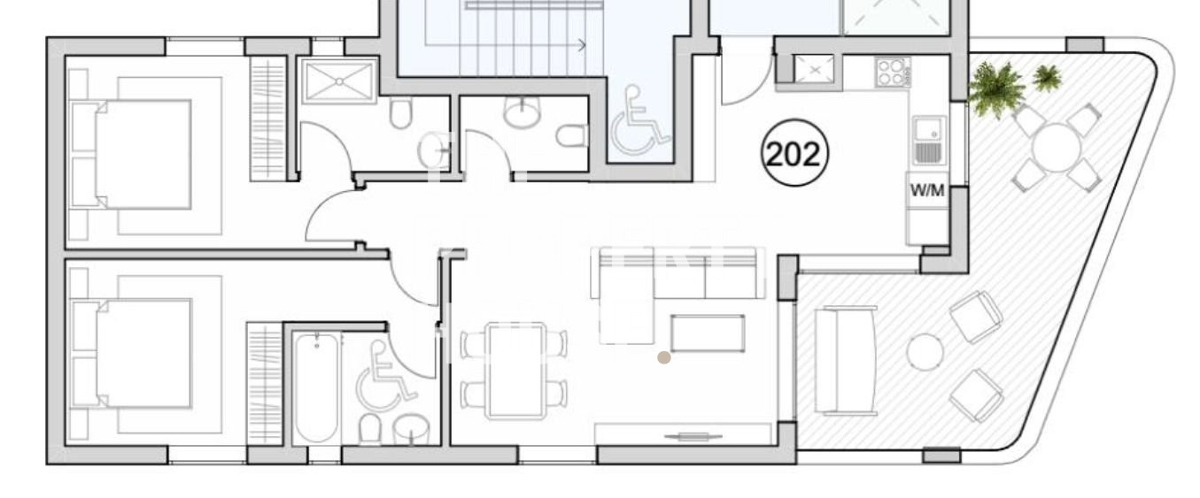 The modern apartment features an open plan living, dining and kitchen area with a guest toilet. There is a master bedroom with an ensuite bathroom, a second bedroom, a bathroom with disabled facilities and a spacious veranda.