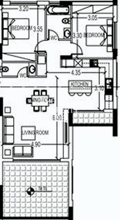 The apartment features an open plan layout with a living, dining and kitchen area and a guest toilet. There are two bedrooms and a bathroom.