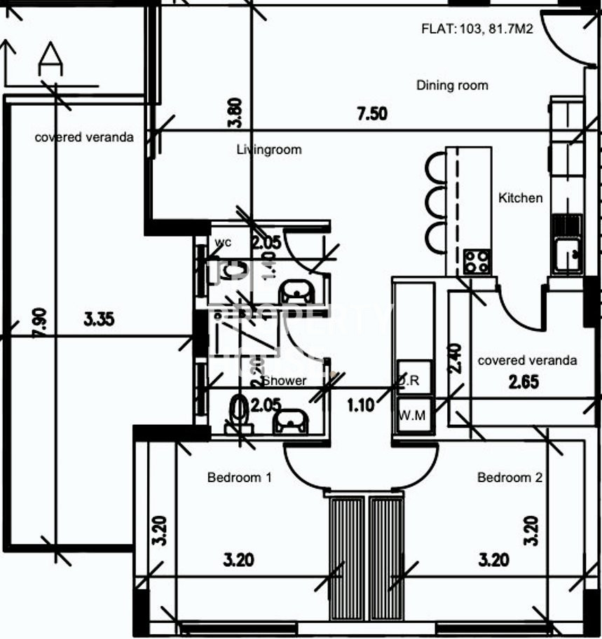 The apartment features an open plan living, dining and kitchen area leading onto a large veranda. There are two bedrooms, a bathroom, a guest toilet and another veranda. On the ground floor there is a covered parking space and a storage room.