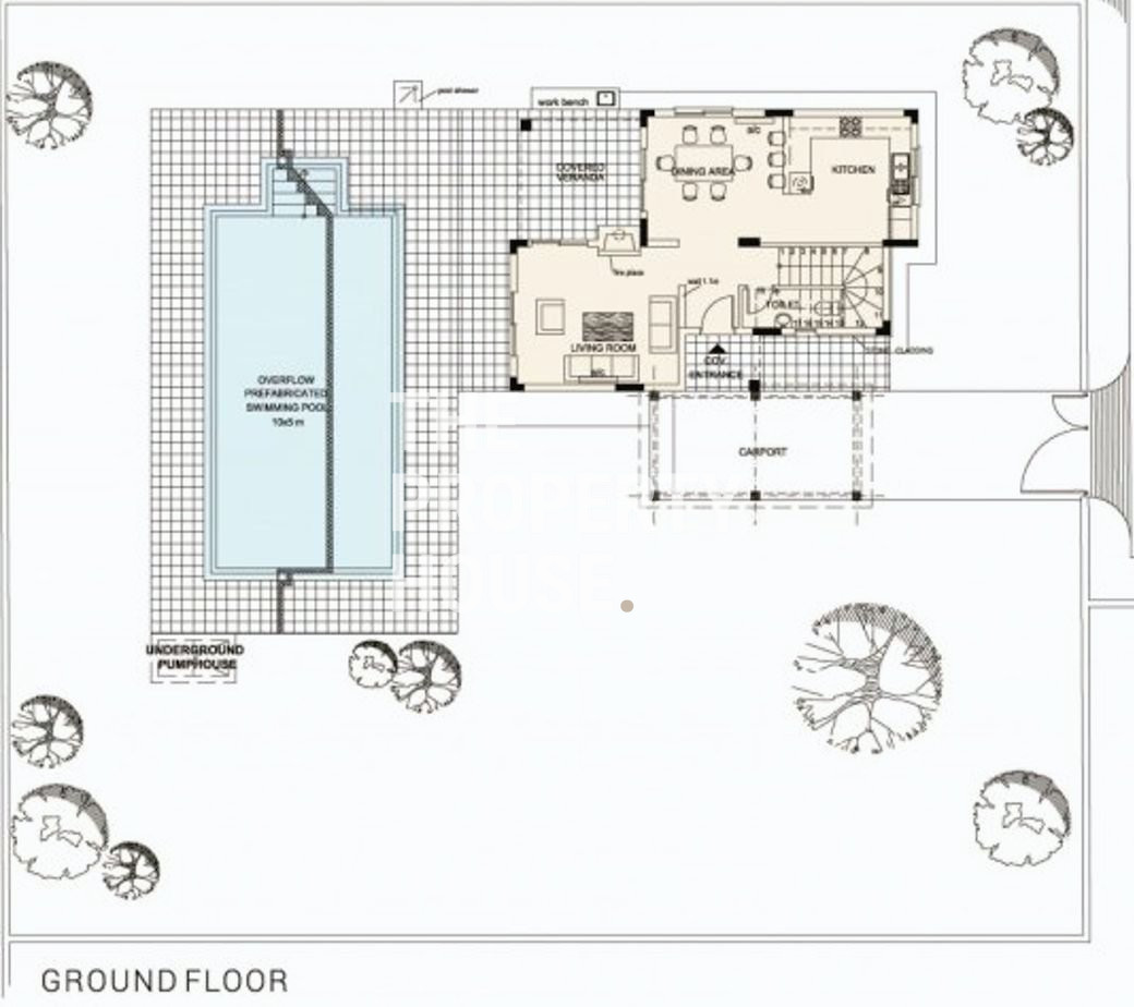 The villa features an open plan living area with a guest toilet, leading onto veranda, a swimming pool and large landscaped garden. The first floor features three bedrooms, a balcony and two bathrooms. The master bedroom has an ensuite bathroom. The large plot of 821 m² also hosts a covered parking space.
