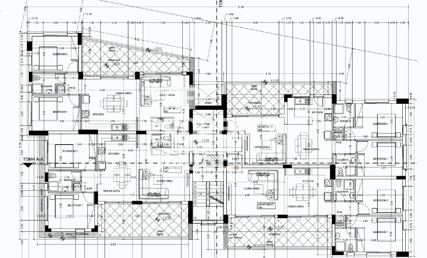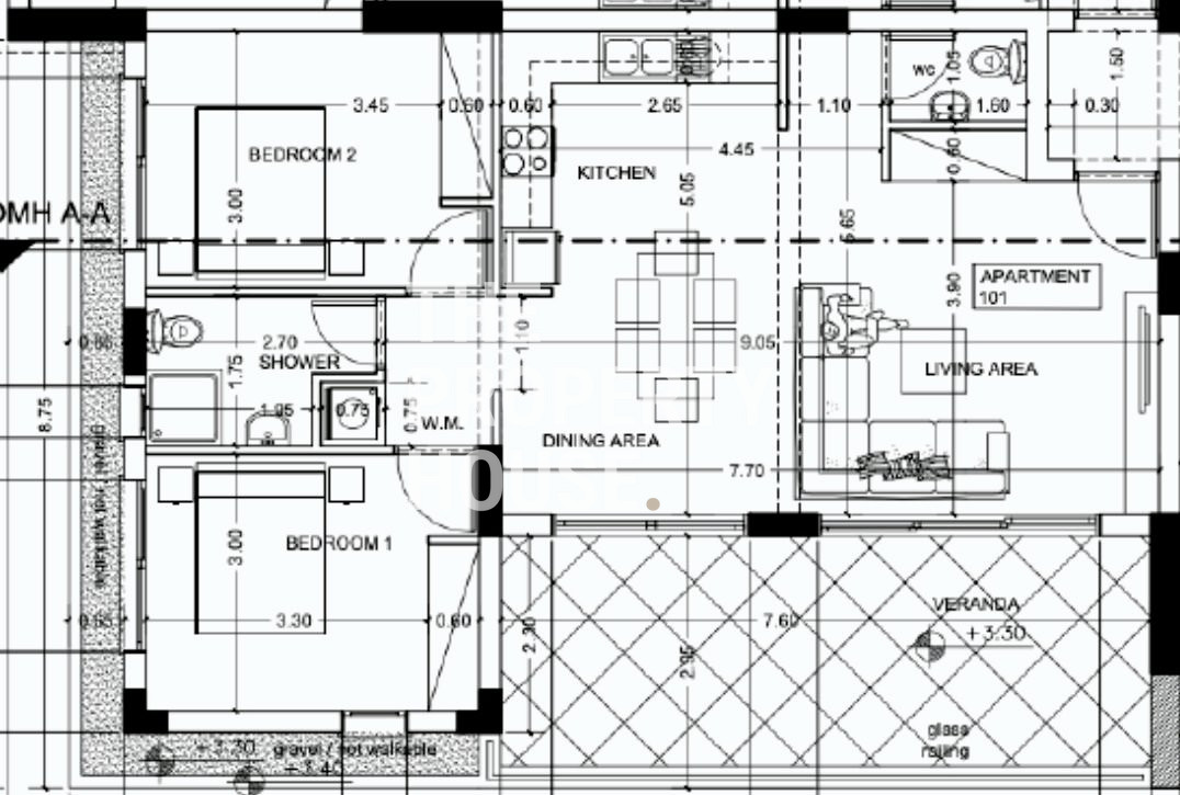 The apartment features a spacious open-plan living, dining and kitchen area with a guest toilet, opening onto a large covered veranda. Through a doorway we find two bedrooms and a bathroom.