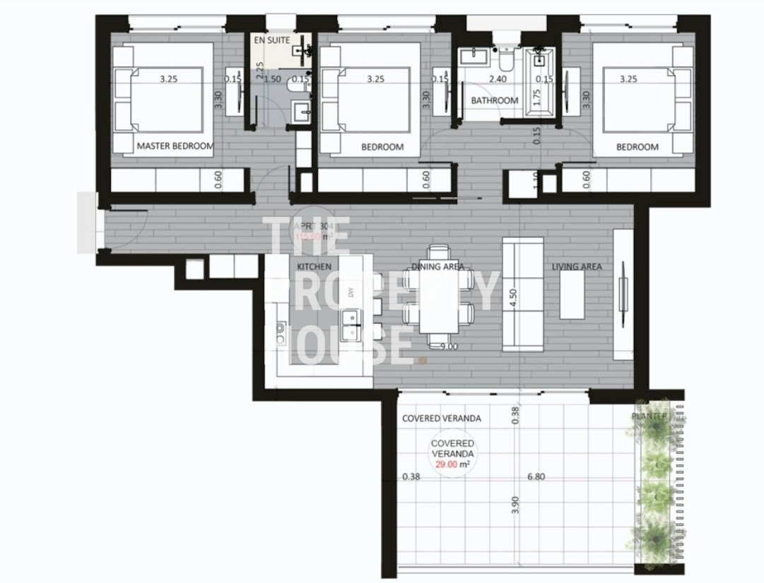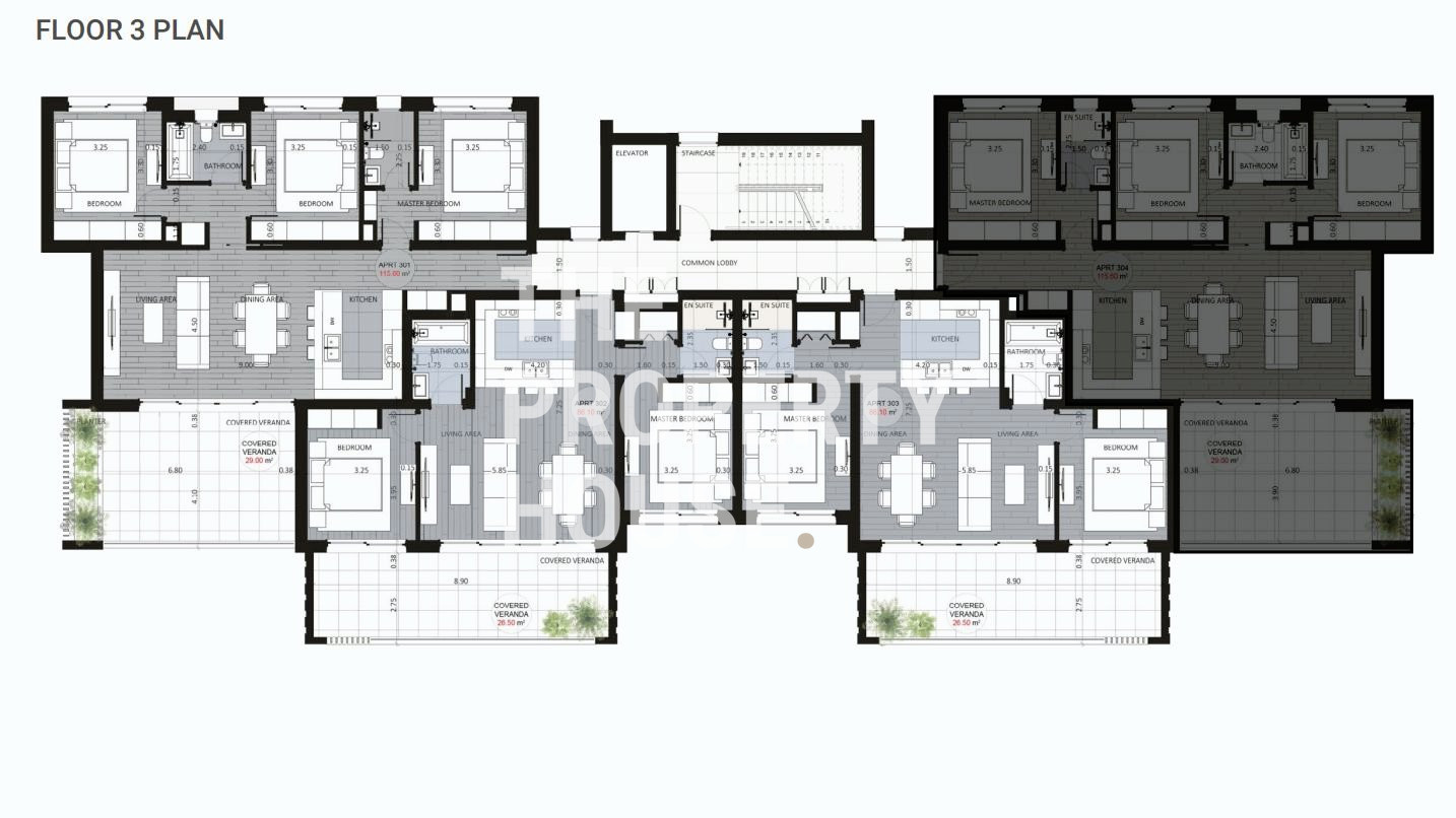 The 115m2 apartment consists of living room and kitchen, 3 bedrooms (one of which is ensuite), a main family bathroom and a large 29m2 covered veranda. There is also covered parking for 2 vehicles and a storage room. A central VRF air-conditioning system will be installed, as well as provisions for underfloor heating.