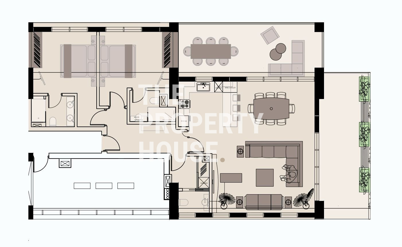 The apartment boasts an expansive living area connected to two large verandas, ideal for summer living and entertaining. The sleeping quarters consist of two master bedrooms with ensuite bathrooms and an ensuite maid's room.