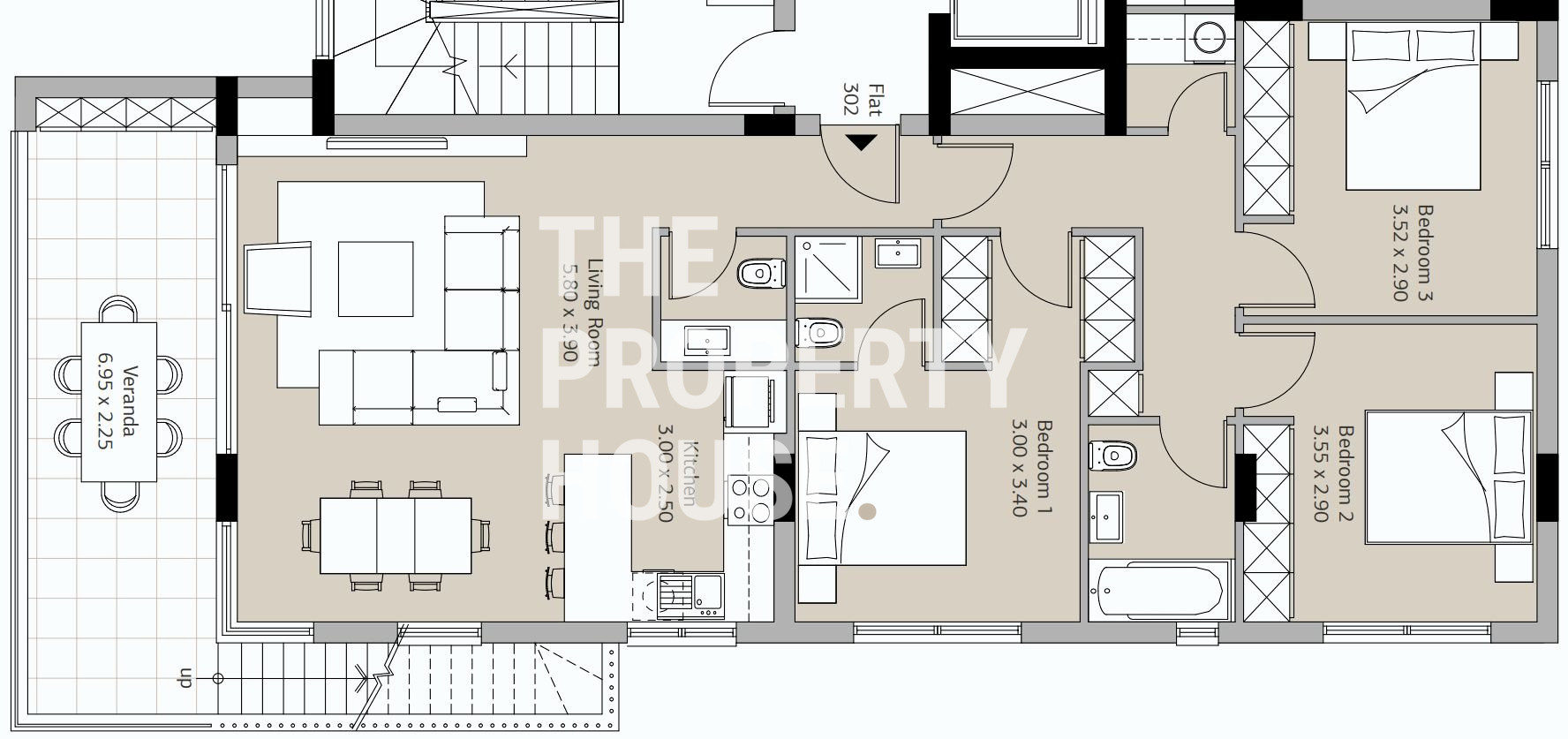 This impeccably penthouse boasts an open plan living area, complete with a convenient guest toilet, leading to a spacious covered veranda perfect for relaxing or entertaining. The living space transitions to the sleeping quarters, where you'll find three beautifully bedrooms and two modern bathrooms, including a luxurious master bedroom with an ensuite bathroom.