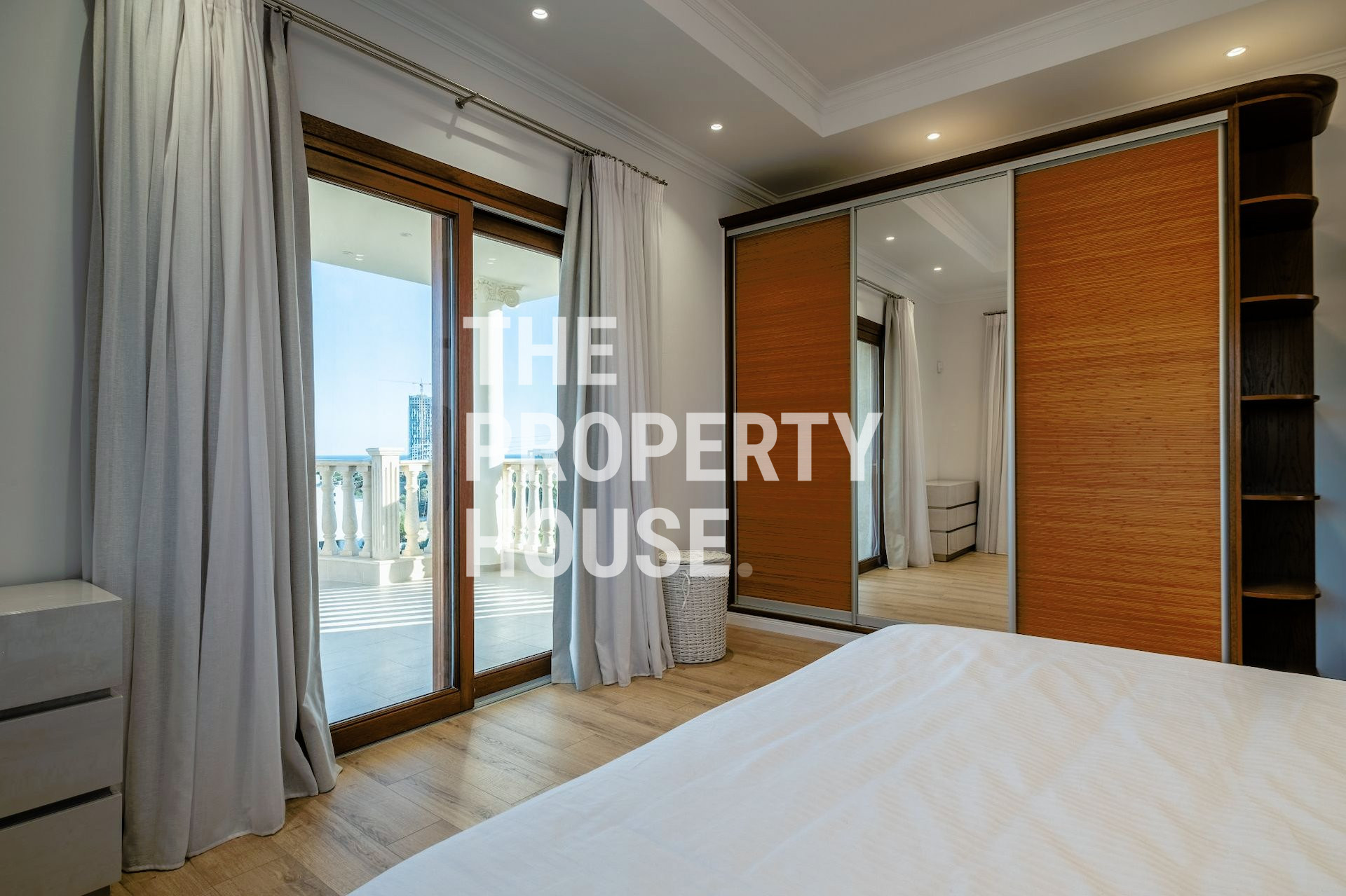 -Italian fabric curtains and Iroko wooden frame windows, doors, and wardrobes.