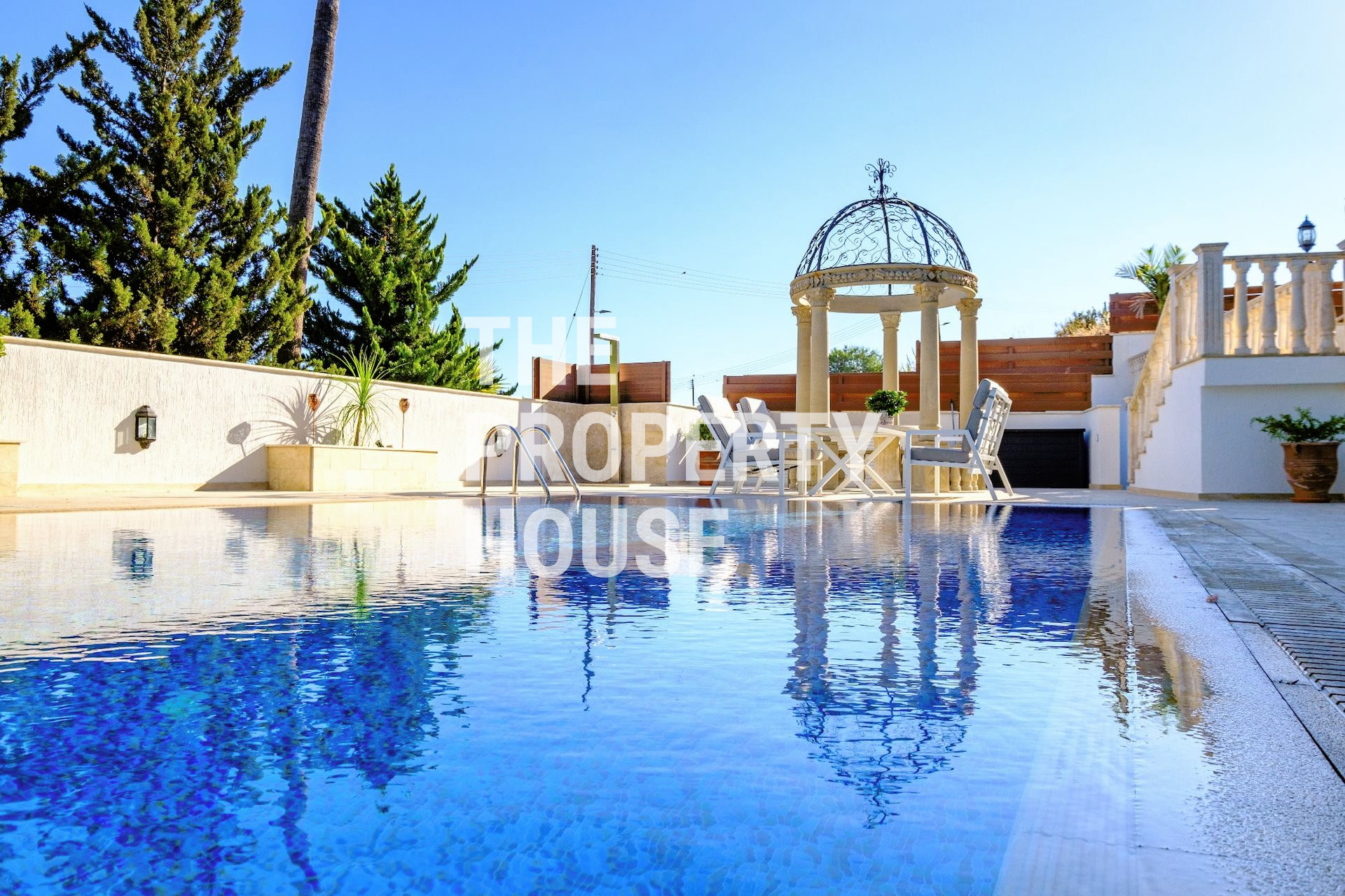 -Outside, enjoy the saltwater swimming pool, two BBQ areas, mature gardens, a centerpiece handmade -fountain, and a stone and marble gazebo. Covered enclosed parking and a sauna add to the luxury.