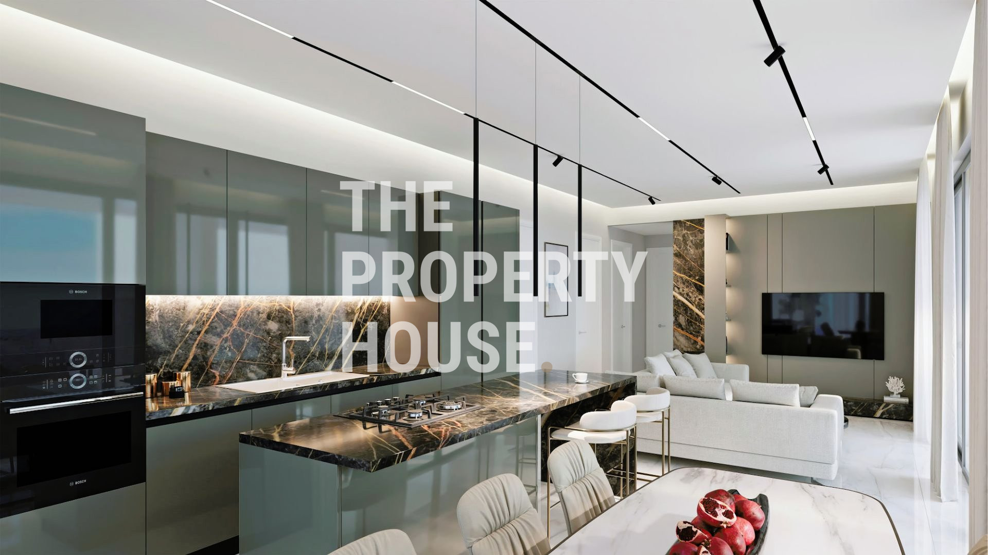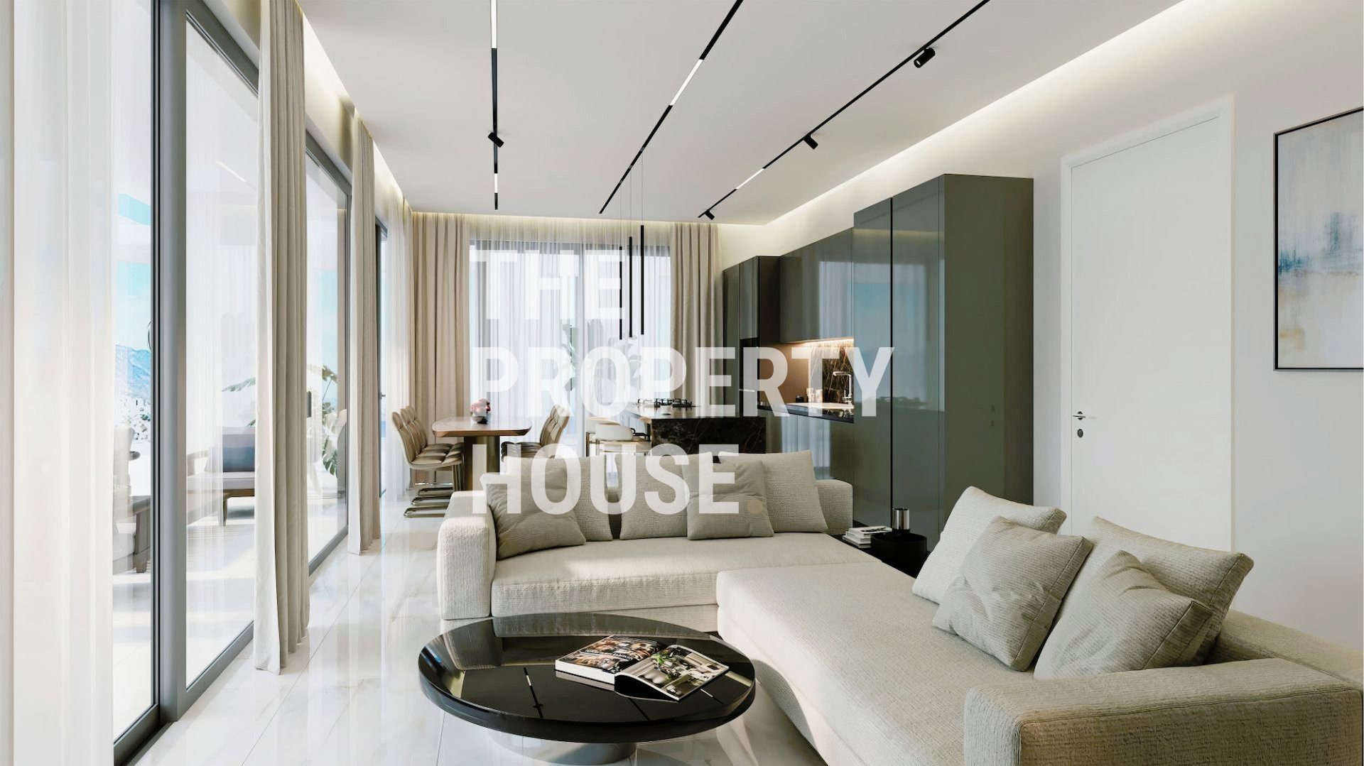 The apartment’s kitchen exudes sophistication, featuring a bright, neutral palette complemented by elegant marble countertops and flooring, with subtle, tasteful accents throughout. The open-plan living area creates a warm and welcoming atmosphere, with earthy, neutral tones that seamlessly connect the kitchen and dining spaces—perfect for relaxed, yet refined living.