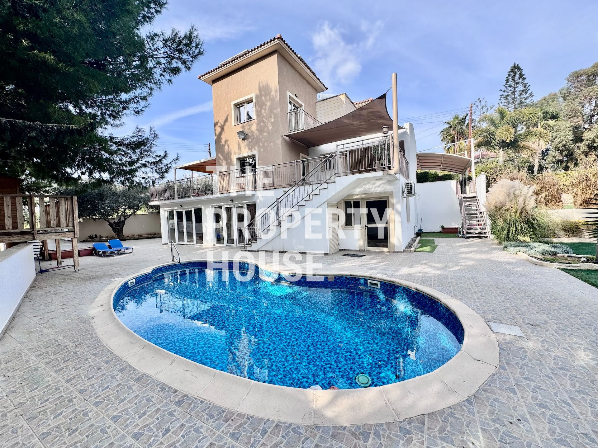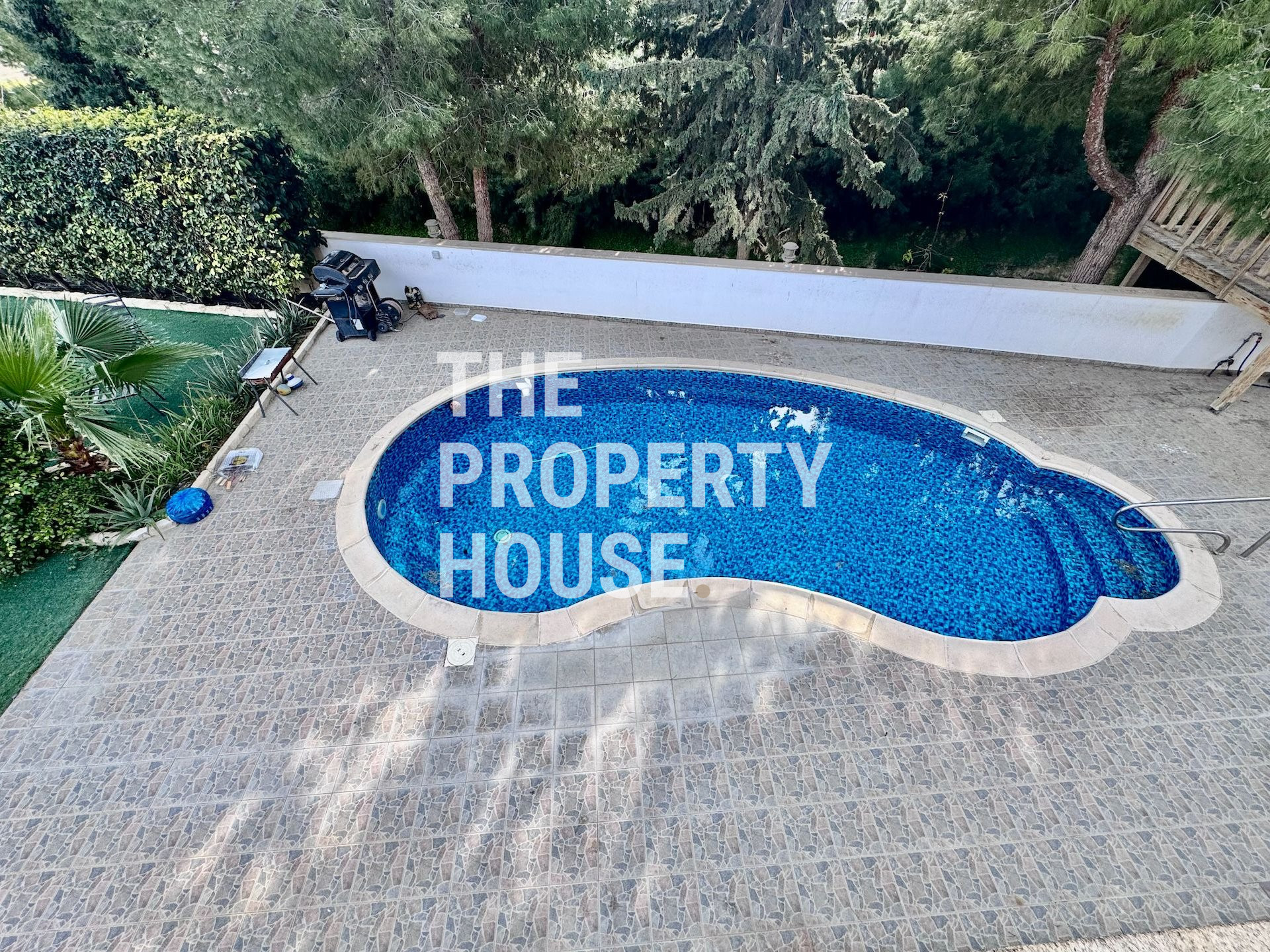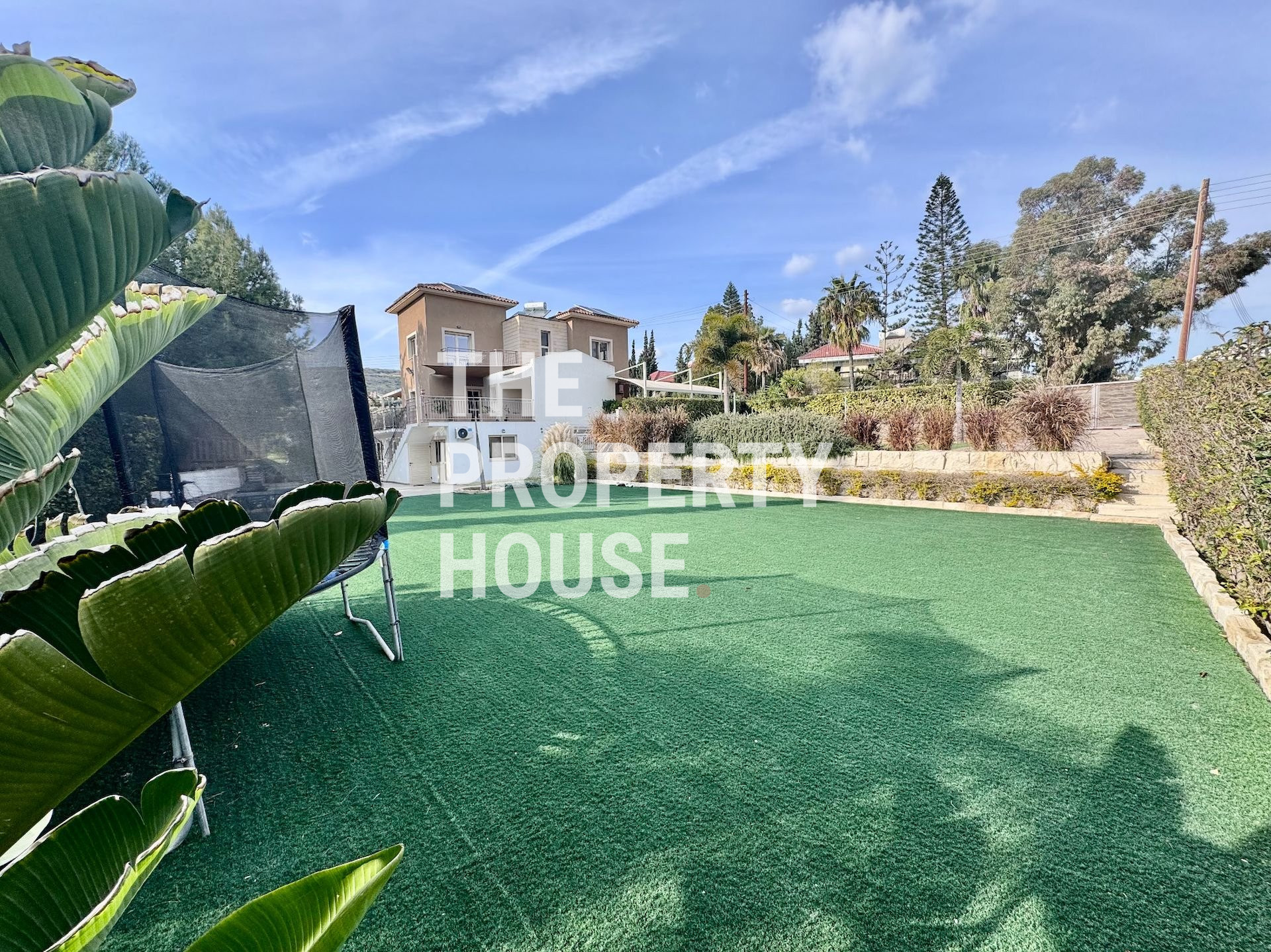 Situated on a generous 1,300 m² plot, the villa boasts beautifully landscaped gardens set across multiple levels. The outdoor space features a large swimming pool with a dedicated pool house, as well as a spacious grass area—perfect for children to play football or for hosting outdoor gatherings.