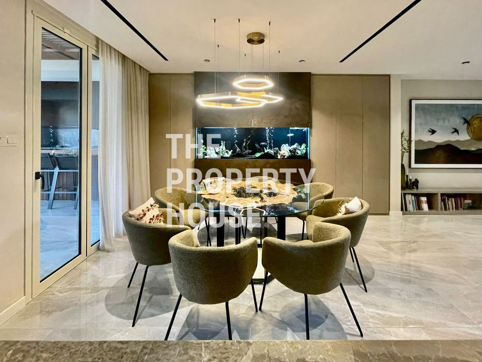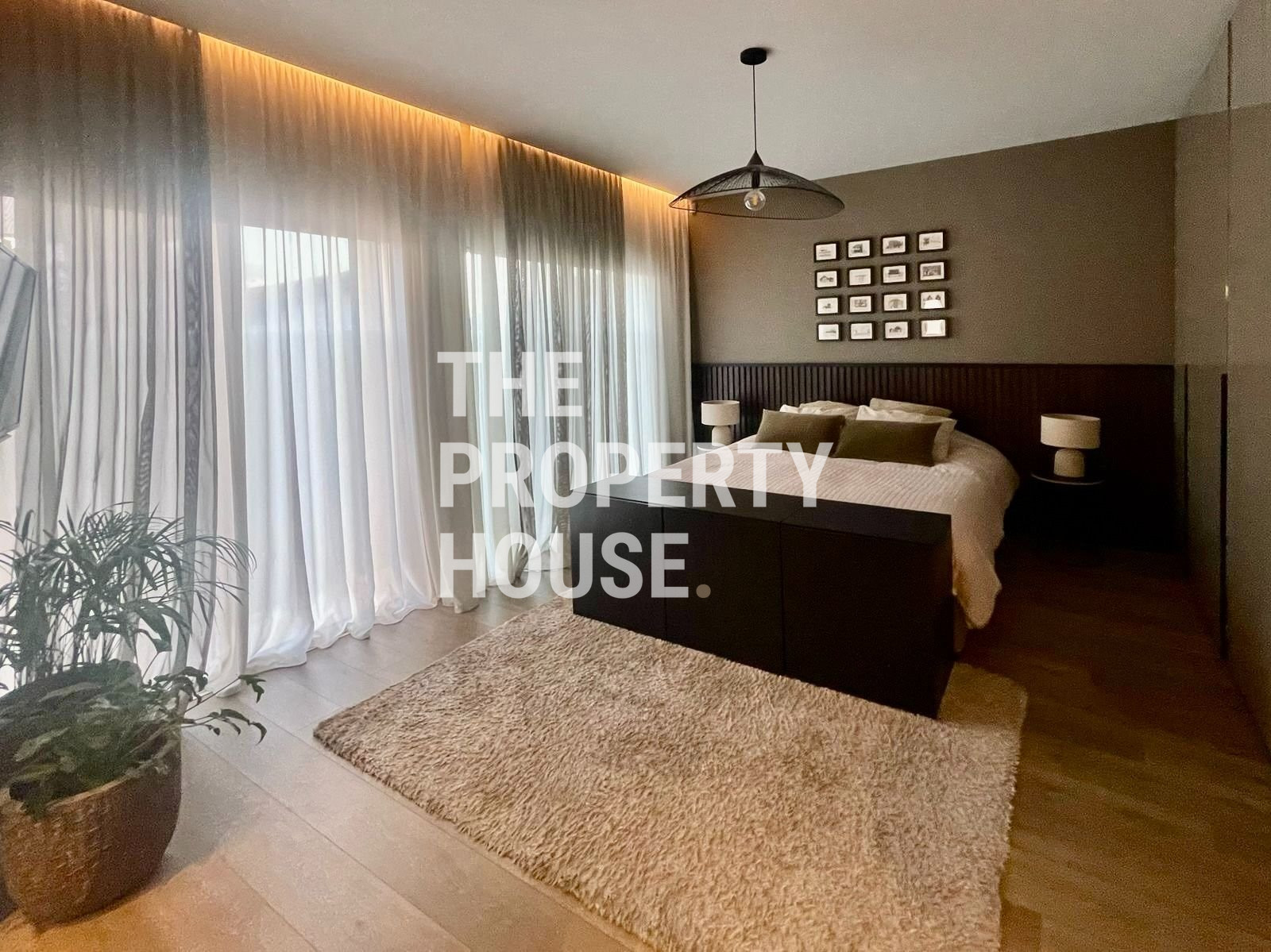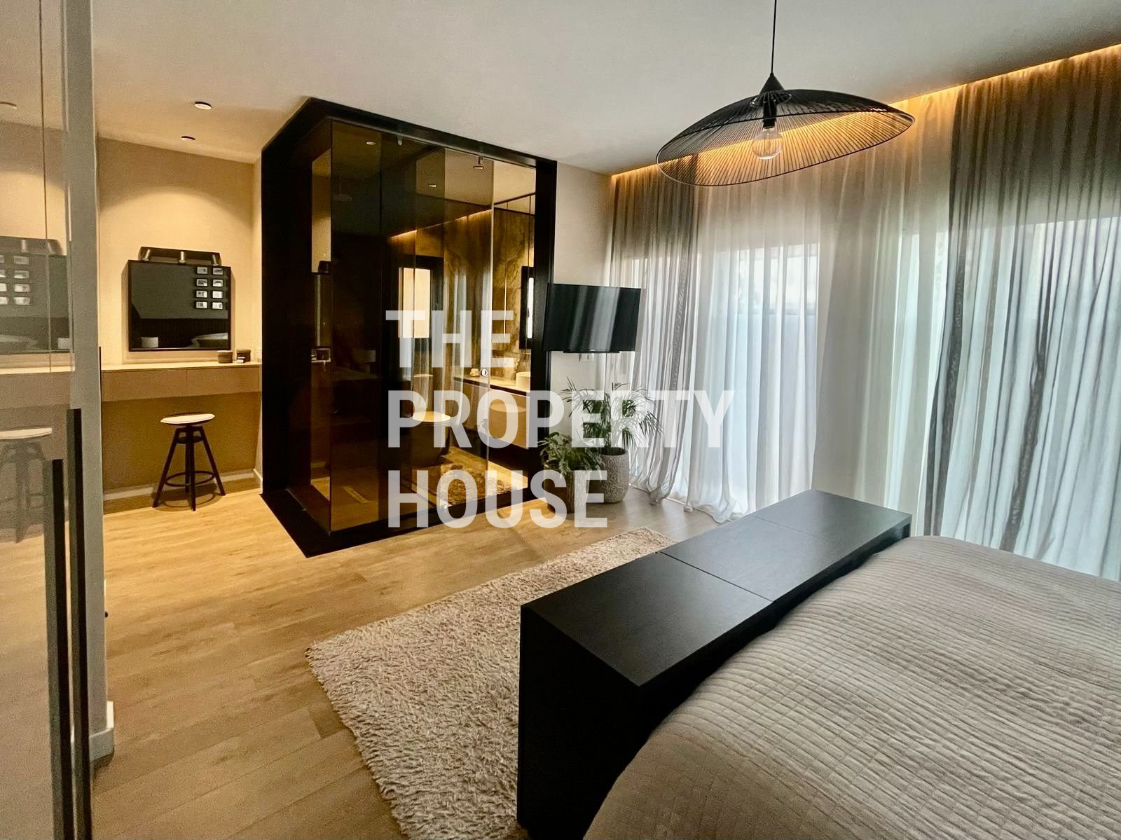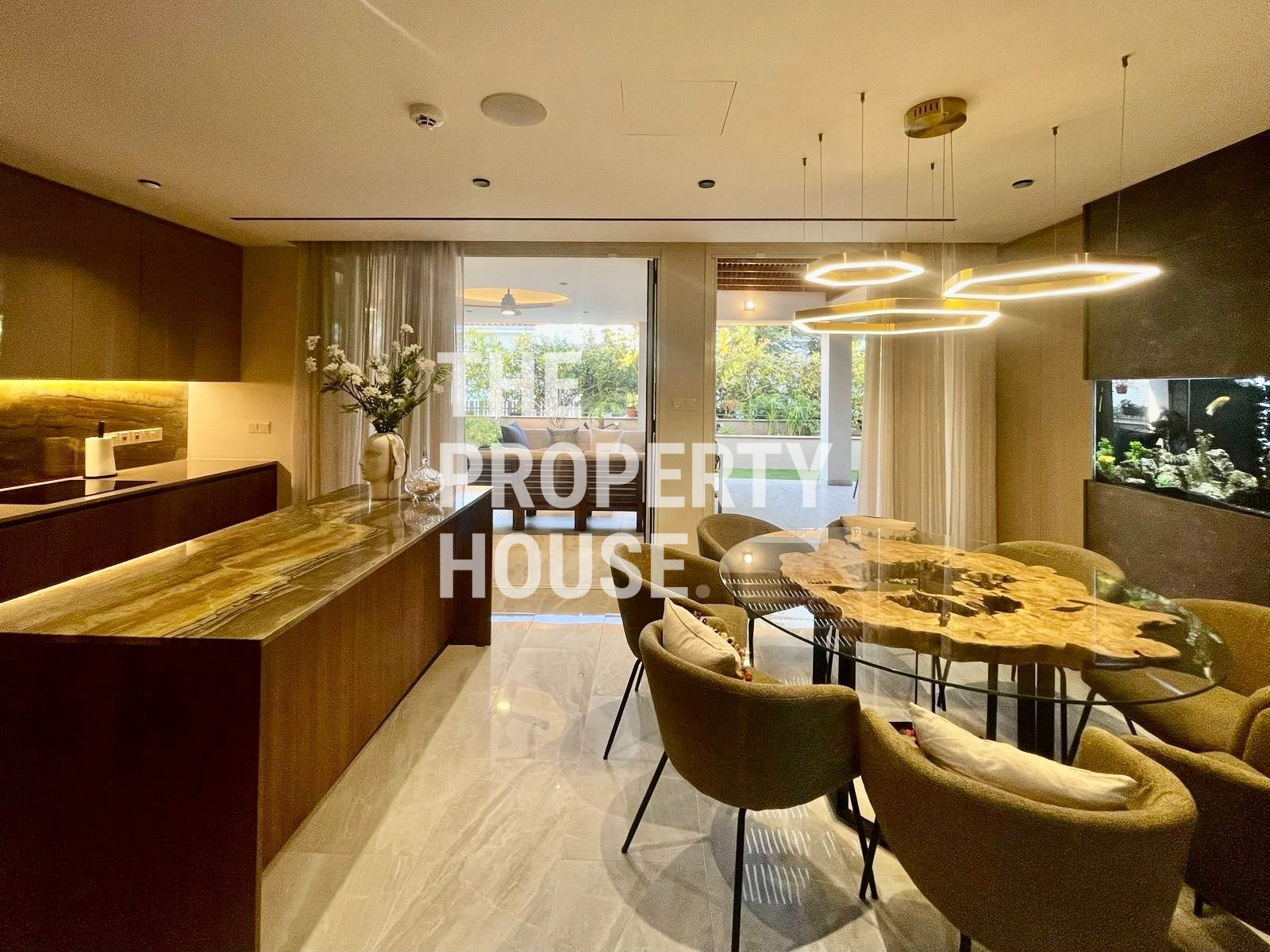 Thoughtfully designed with both style and comfort in mind, the home welcomes you with a warm, inviting atmosphere the moment you walk in. The ground floor features a spacious open-plan layout, with a cozy living area complete with a fireplace, a sleek kitchen with a central island, and a dining area enhanced by a unique built-in tropical fish tank. Integrated sound systems and large sliding doors open up to the lush private garden, where you’ll find a second living area, outdoor TV lounge, a full outdoor kitchen, and a bar—perfect for entertaining guests.