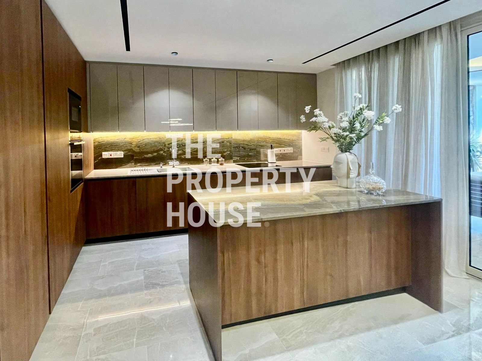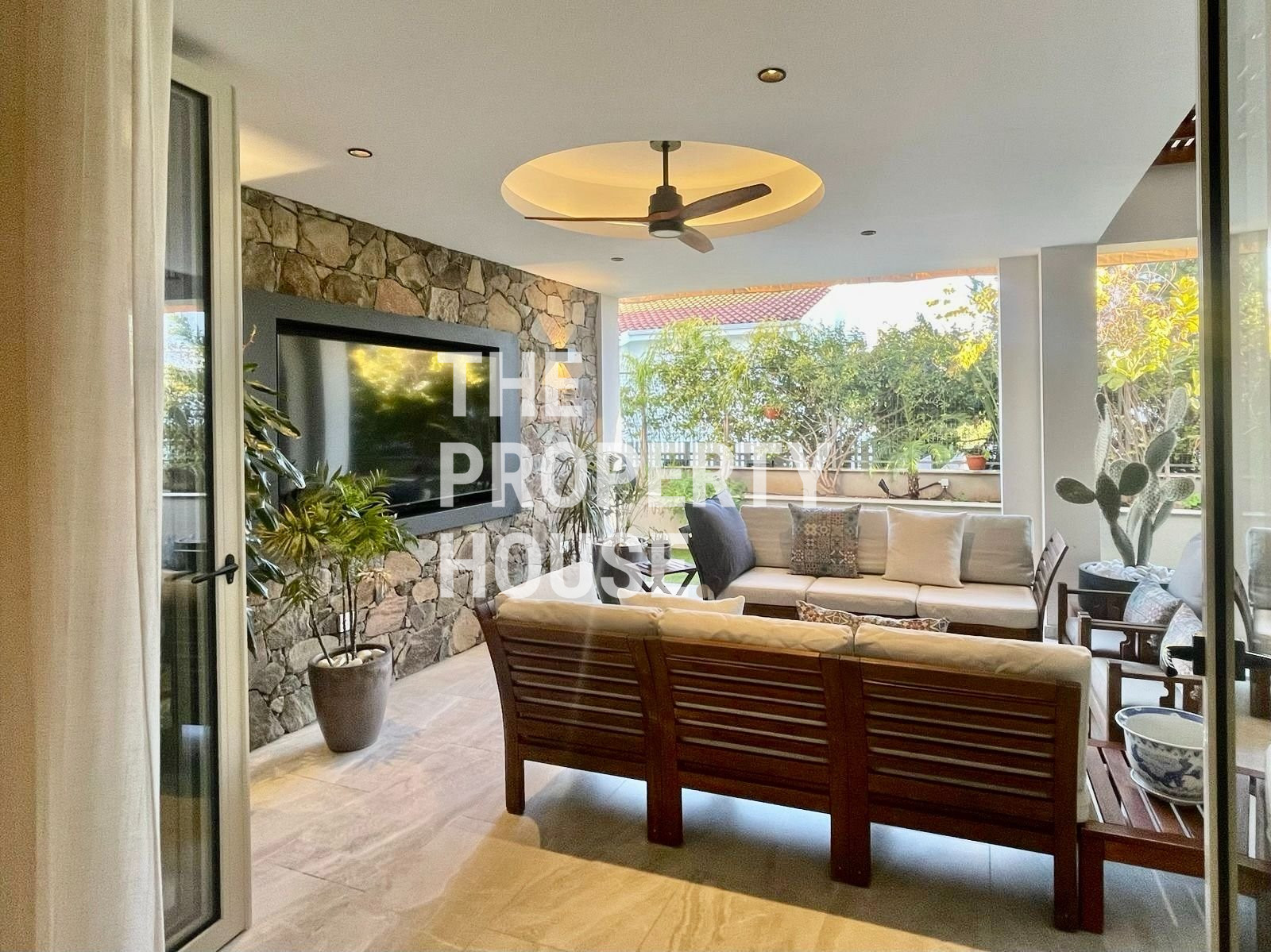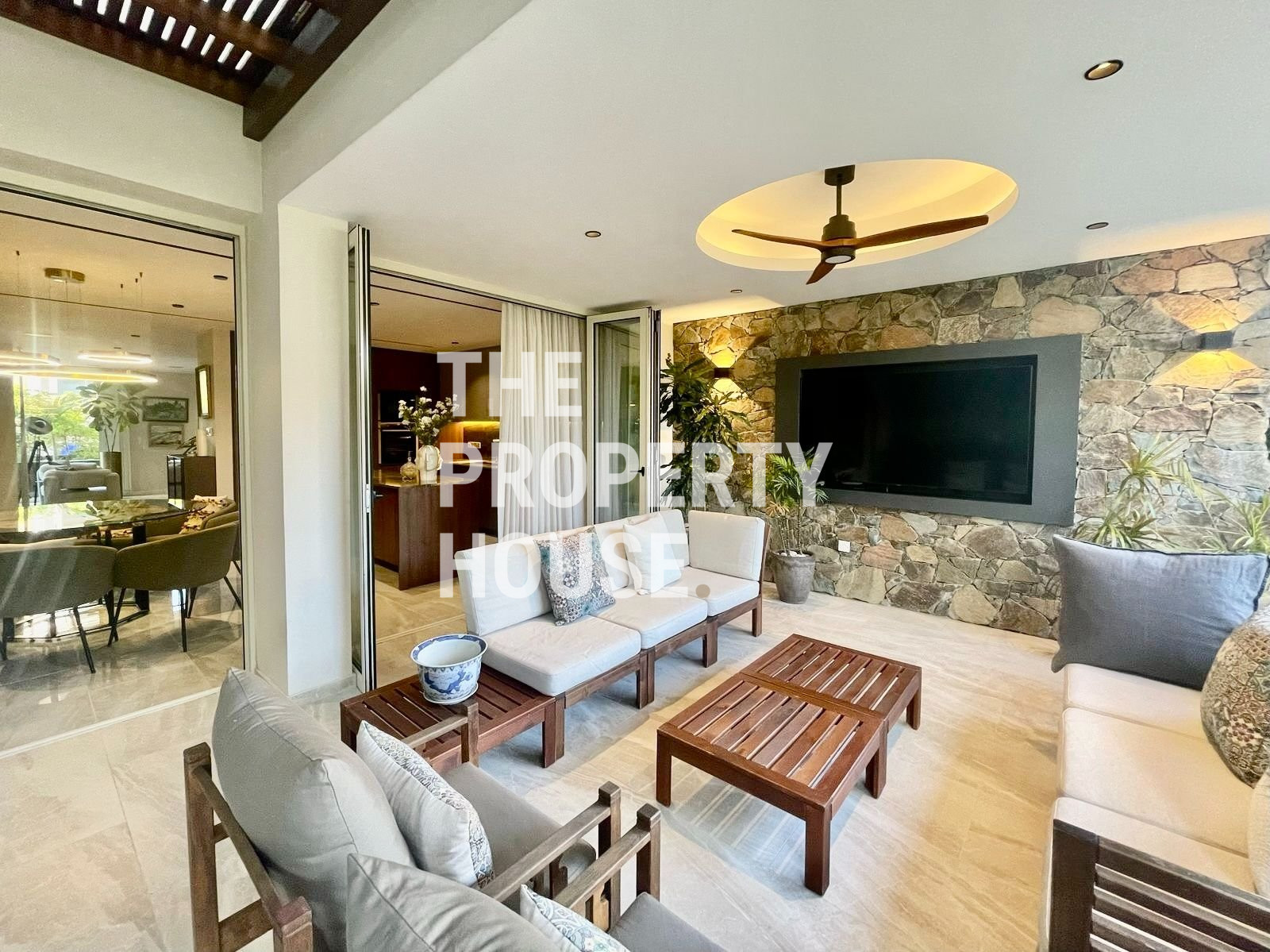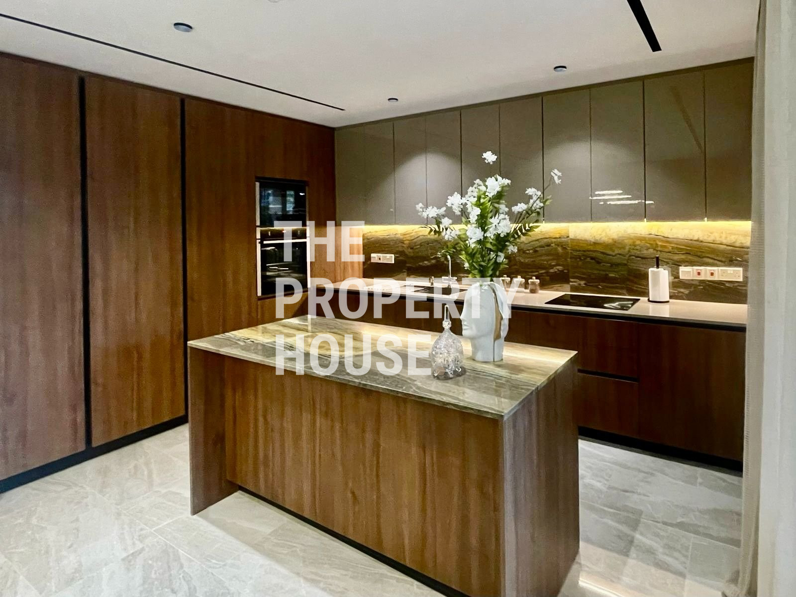 Thoughtfully designed with both style and comfort in mind, the home welcomes you with a warm, inviting atmosphere the moment you walk in. The ground floor features a spacious open-plan layout, with a cozy living area complete with a fireplace, a sleek kitchen with a central island, and a dining area enhanced by a unique built-in tropical fish tank. Integrated sound systems and large sliding doors open up to the lush private garden, where you’ll find a second living area, outdoor TV lounge, a full outdoor kitchen, and a bar—perfect for entertaining guests.