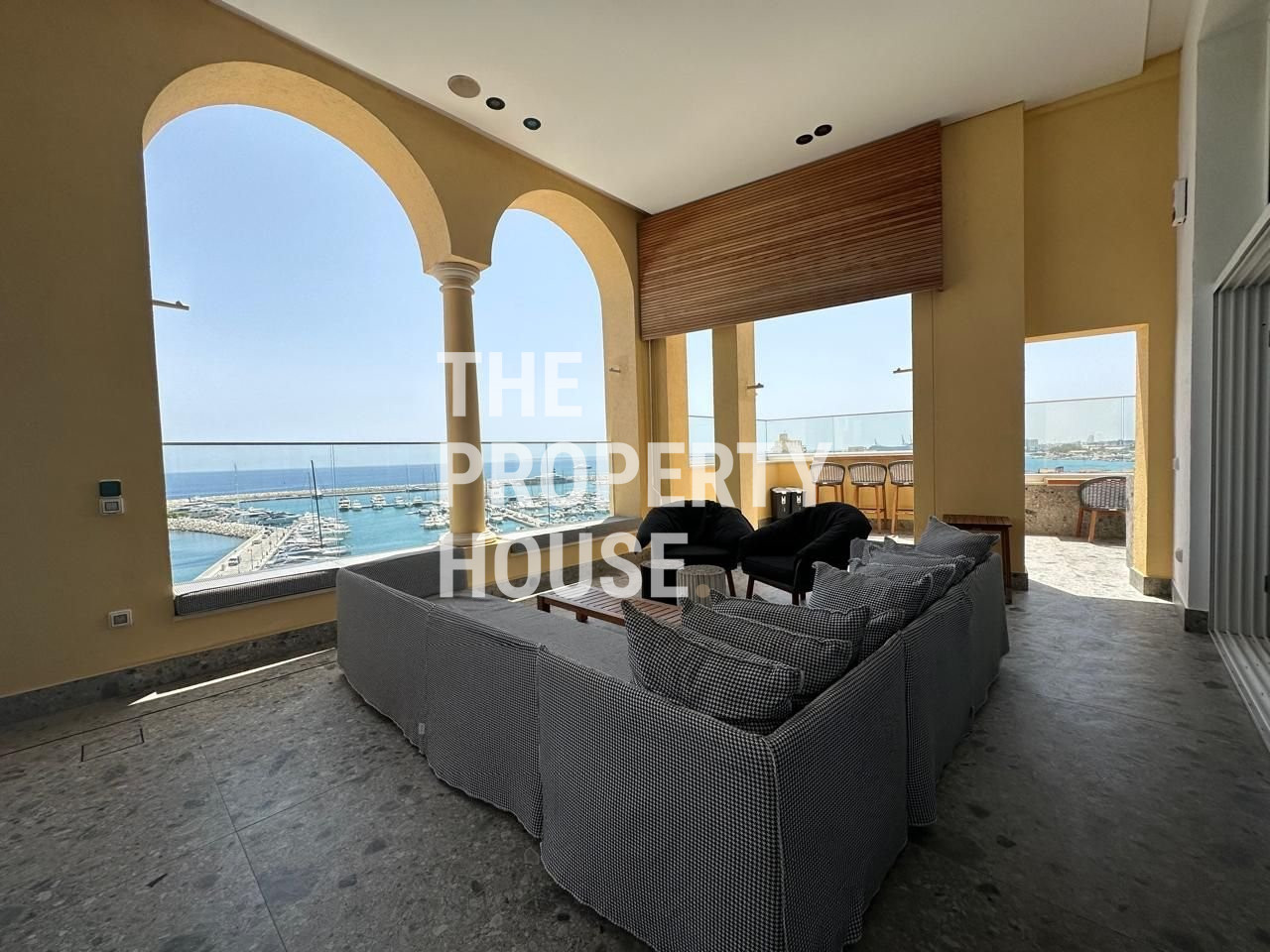 Floor-to-ceiling windows flood the home with natural light and showcase breathtaking panoramic sea views from nearly every room. The outdoor living space is equally impressive, featuring Salt and Pepper designer furniture, an outdoor fridge, and an ice machine—perfect for entertaining against the backdrop of the marina and the Mediterranean Sea.
