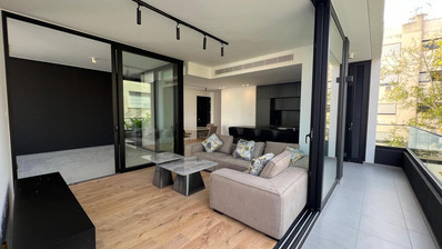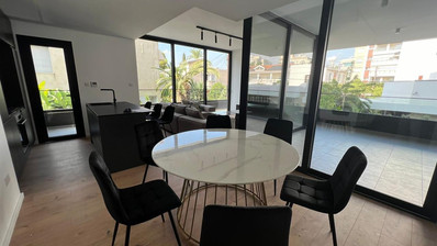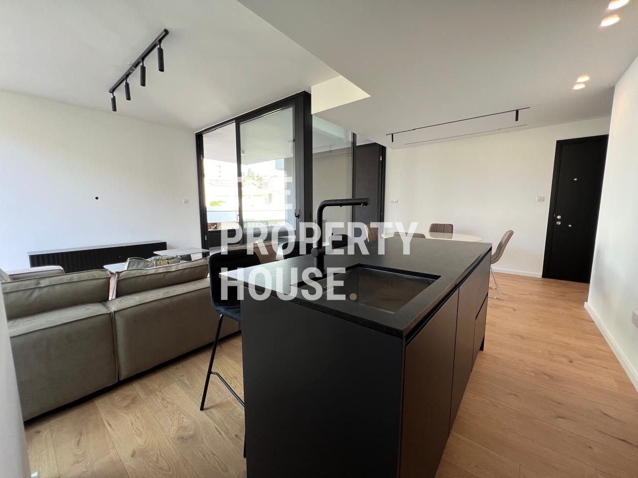 This spacious two-bedroom apartment is available for rent in the sought-after area of Agia Zoni. Offering 130 square meters of internal space, the home welcomes you with an airy open-plan living and dining area, beautifully furnished with modern pieces for both comfort and style.