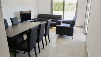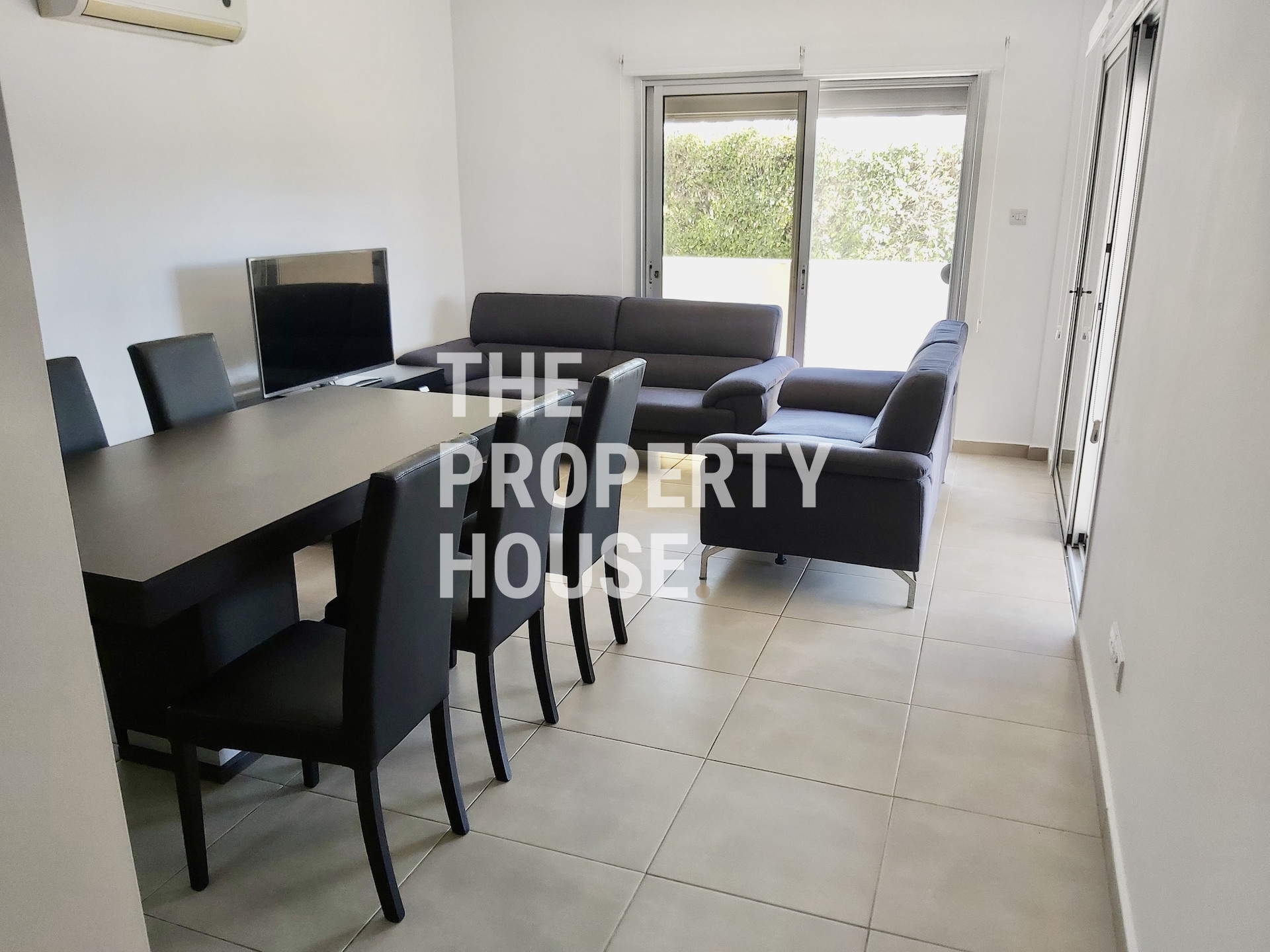 The property features a bright and functional layout with a fully furnished living and dining area, a practical kitchen, and two comfortable bedrooms. Air-conditioning units are installed throughout, with one unit in the living room and one in each bedroom, ensuring year-round comfort.