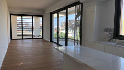 Spanning 121.2 m² of internal living space, the apartment is designed with both comfort and style in mind. The bright open-plan living and dining area flows seamlessly into a fully equipped modern kitchen, creating a welcoming and functional space for everyday living. Large openings enhance the natural light throughout, adding to the sense of space and sophistication.