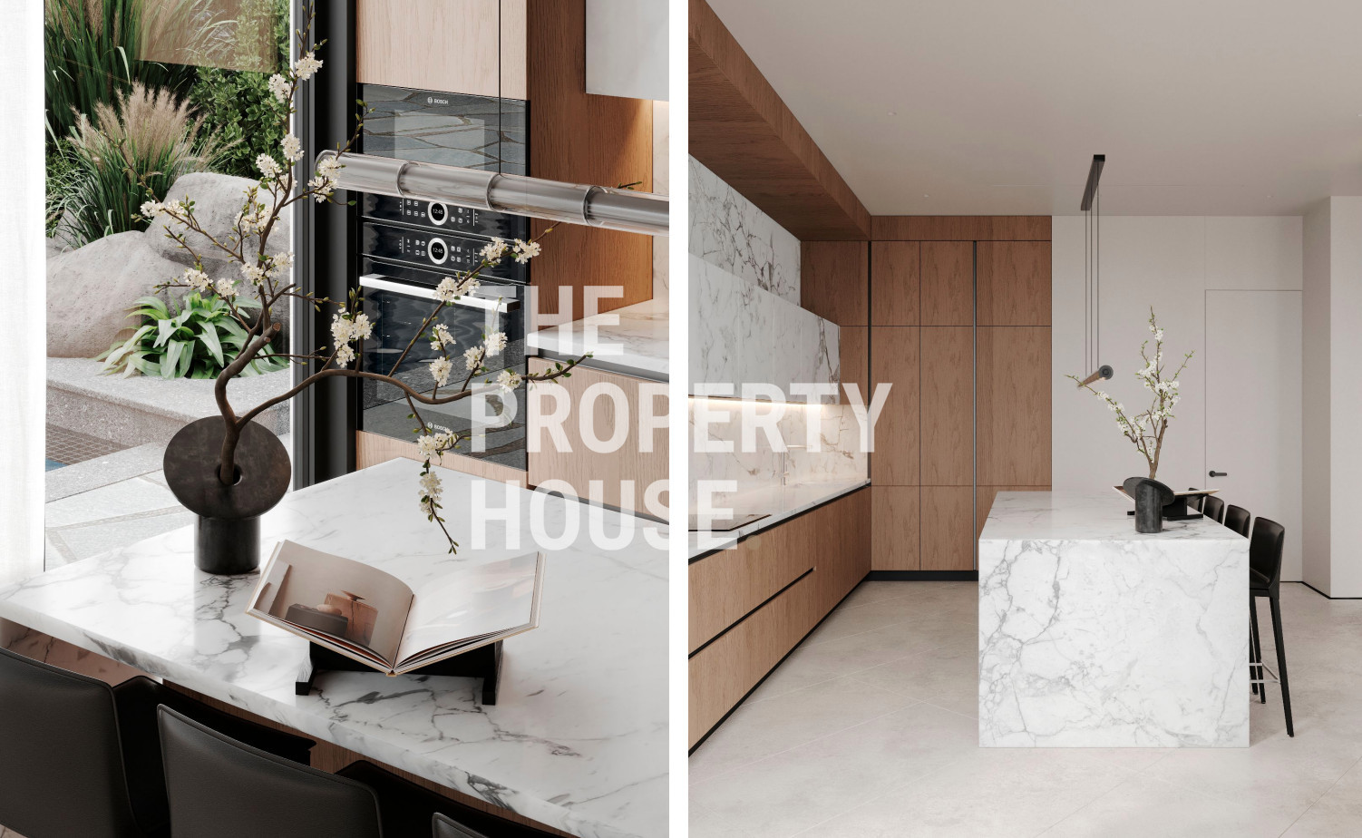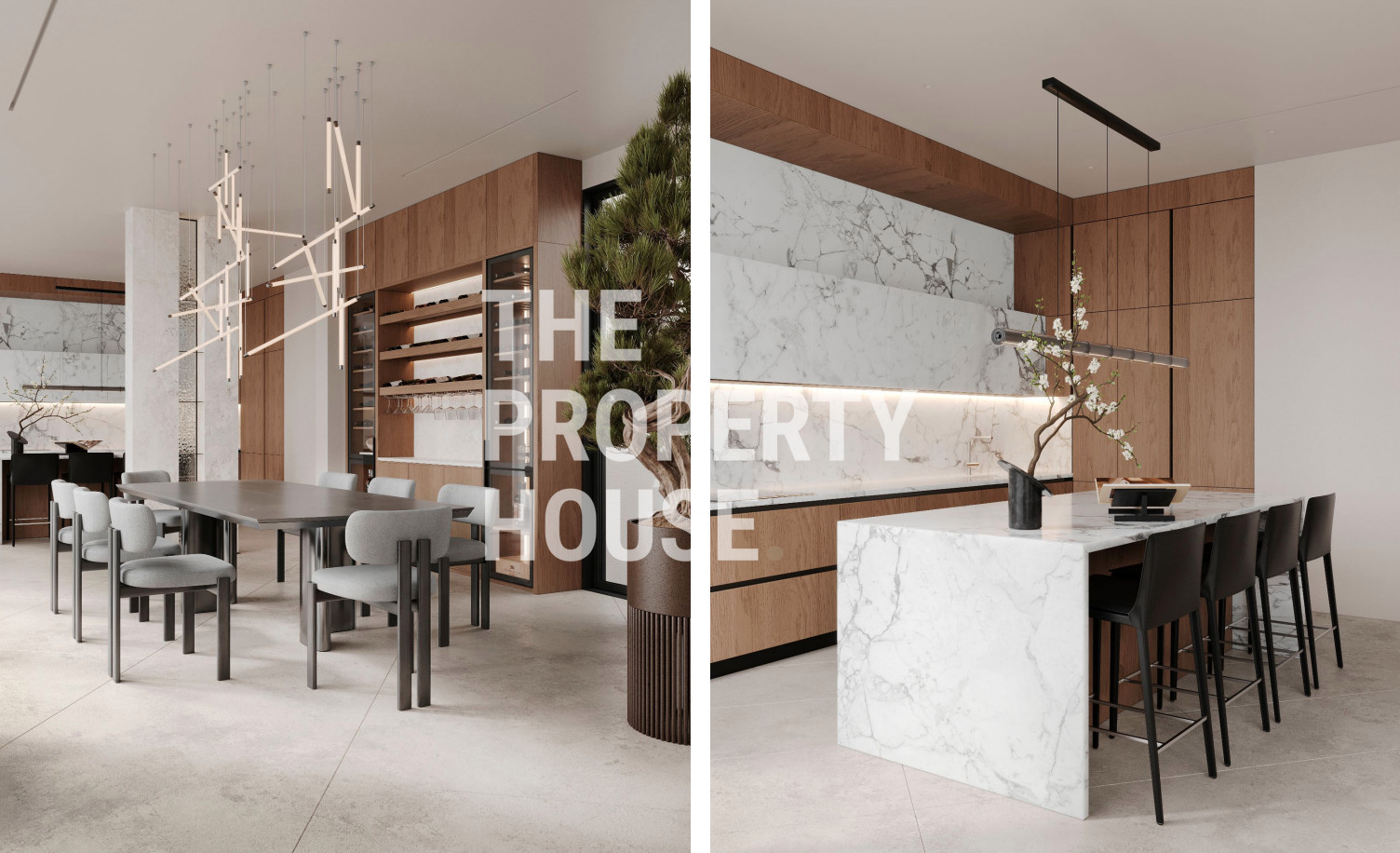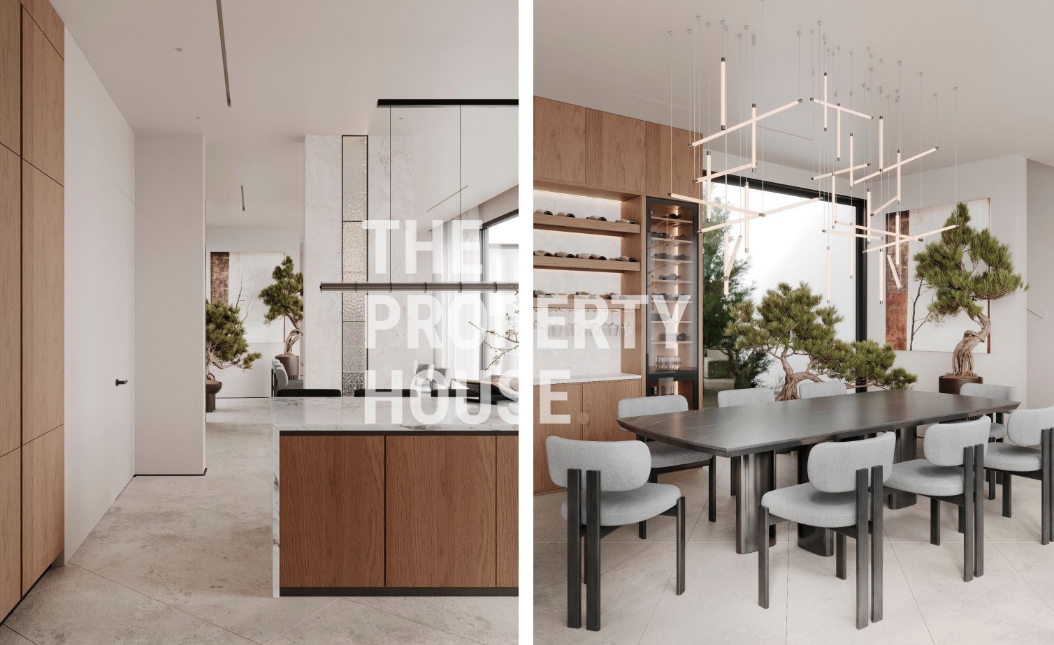 Upon entering the villa, you’re welcomed by a stylish entrance hall with a fitted wardrobe, leading into an expansive open-plan living area. This level also features a spacious living room, a formal dining area, and two kitchens: a main designer kitchen with an island and granite countertops, and an auxiliary kitchen designed for functionality and convenience. Floor-to-ceiling windows open to the beautifully landscaped garden, solarium, and infinity pool, creating a seamless indoor-outdoor flow perfect for entertaining and relaxation.