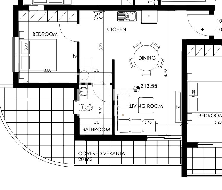 The bedroom is generously proportioned and benefits from direct access to the veranda through large sliding doors, creating a light-filled and comfortable space. A modern en-suite bathroom completes the apartment, offering both privacy and a refined finish.